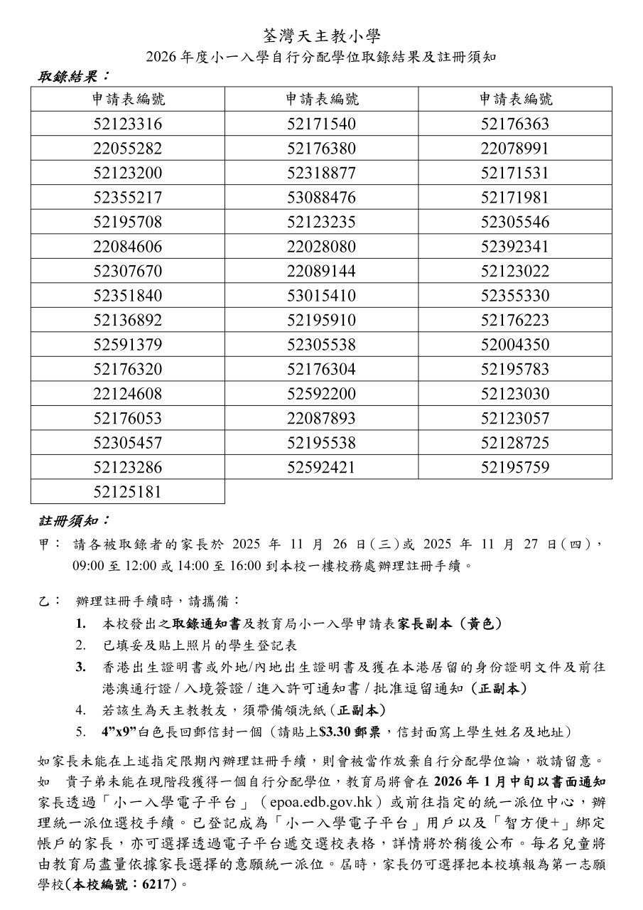 2026年度小一入學自行分配學位取錄結果及註冊須知